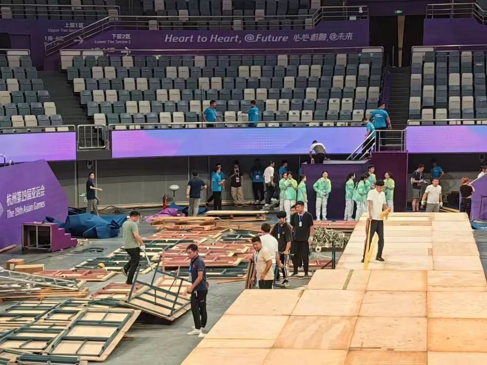 器材转场不是简单的拆卸安装。器材转场考验保障服务人员对器材构造的熟知程度、赛事工作经验的储备、临时工作方案的制定和对转场场地的快速布局。必须做到环环相扣、前后衔接、密切配合、科学高效、安全至上。比如,按组委会要求,杭州亚运会竞技体操结束后,必须在12个小时内把所有器材包括器械垫子、比赛场训练场器材装备等全部撤出。正常来说,这些工作至少需要两到三天的时间,但是因后边的赛事项目衔接比较紧凑,只能在12个小时连夜撤场完毕。